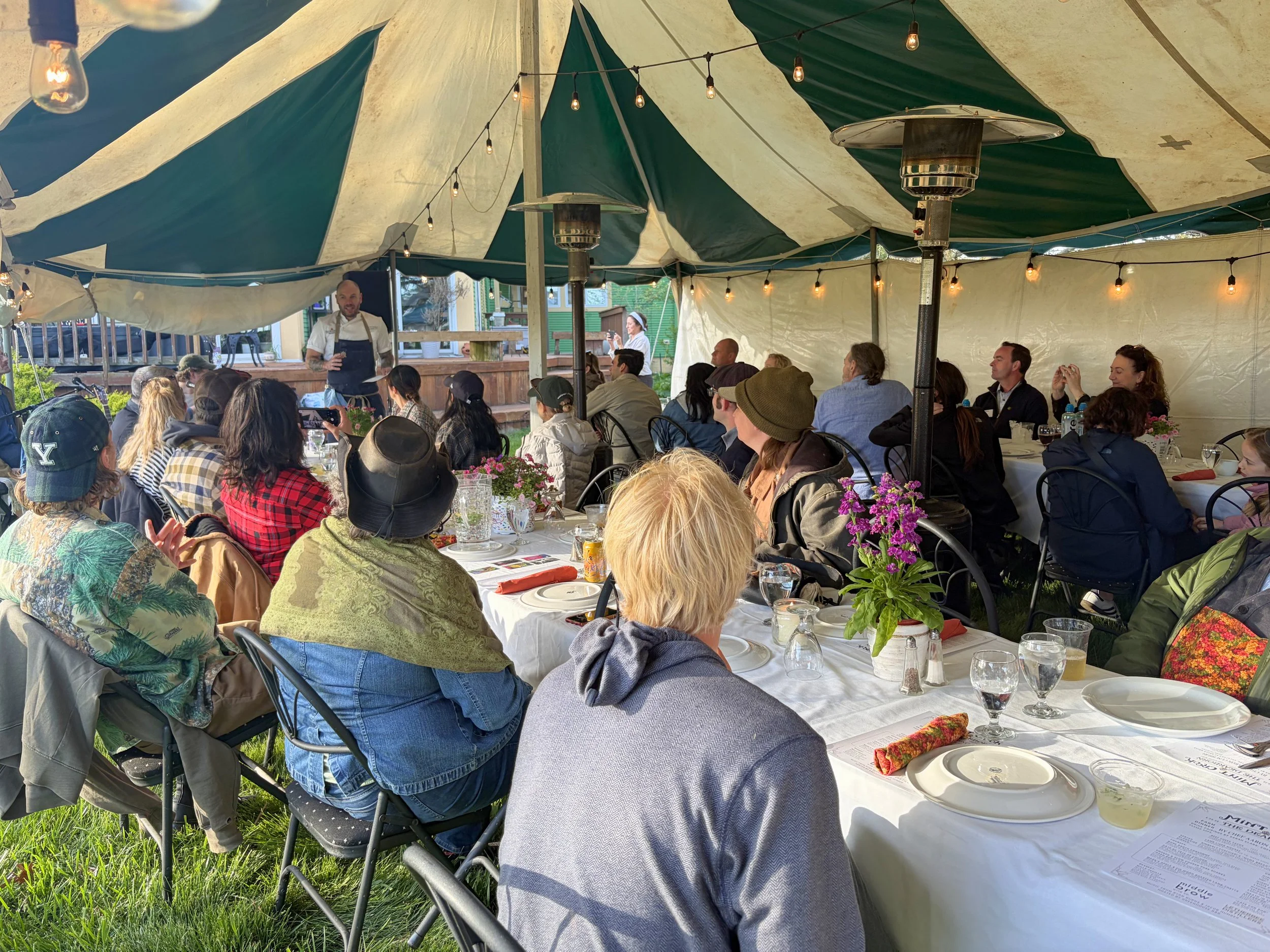On Saturday, April 25th, over 50 guests from across the Chicagoland area came down to Mint Creek Farm for an unforgettable evening of food, drinks, live music, and amazing company. Chef Aaron Cuschieri curated a one-of-a-kind menu featuring cuts of meat that are often overlooked in mainstream cooking, specifically organ meats and cuts that benefit from slow-cooking. The result was a mouthwatering 5-course meal that left guests feeling full and inspired to experiment with similar cuts in their own kitchens!